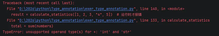 不用类型注解,在给参数赋值的时候发生int到str的错误,运行后会报错: