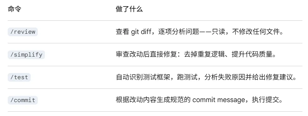 终端截图:完整工具调用流程 + 四步 Skill 连用(review → simplify → test → commit)