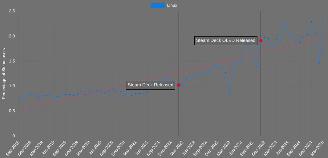 到 2025 年底,Steam Deck 销量超过 560 万台,占 Linux 版 Steam 用户的 27%。但更重要的是,它改变了几百万玩家对 Linux 的认知:用 Linux 玩游戏,不是自我折磨,是可以比 Windows 更顺畅的事。