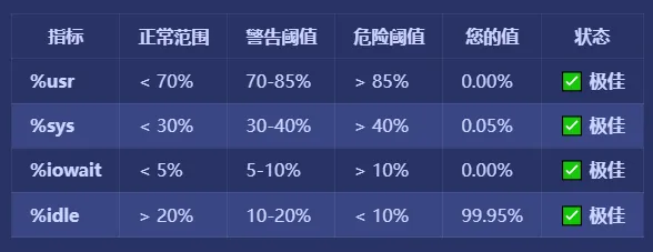 %idle:CPU空闲时间百分比。数值过低(如持续<10%)表明CPU资源紧张。