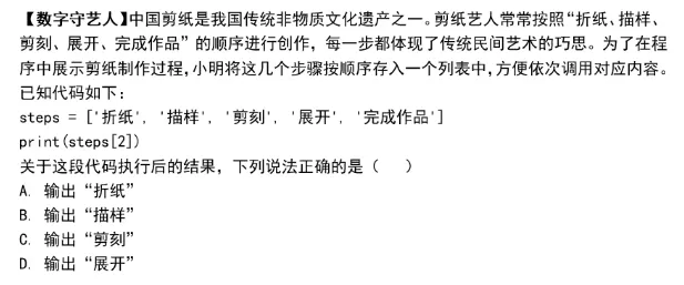 - 客观题示例:围绕“剪纸步骤”,考查列表索引这一基础知识。题目中列表索引从0开始,