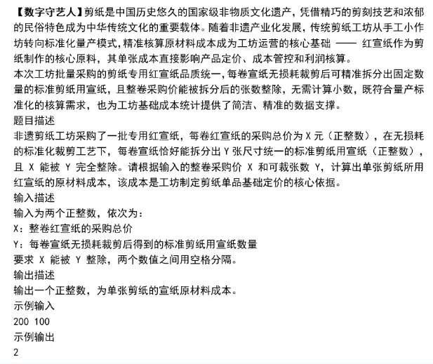 - 编程题示例(“红宣纸成本计算”):题目要求根据整卷采购价X和可裁张数Y,计算单张成本。这本质上是一个整数除法问题。