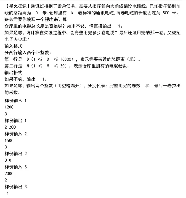- 编程题示例(“通讯电缆架设”):题目要求判断电缆是否够用,并计算完整使用的卷数和最后一卷用量。