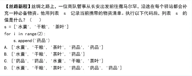 s = ['水囊', '干粮', '茶叶'] 及循环代码 for i in range(2): s.append('药品'),要求确定执行后列表的值。考查对列表这一基础数据结构进行动态修改的流程理解,是处理有序集合数据的前提。