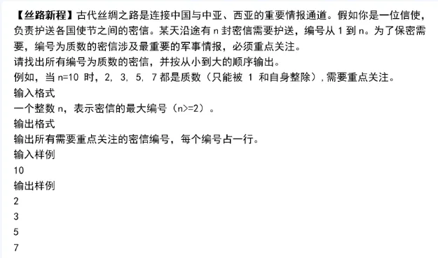 - 编程题示例(“丝路密信”):题目要求找出1到n(n>=2)之间所有的质数(即只能被1和自身整除的数),并按行输出。