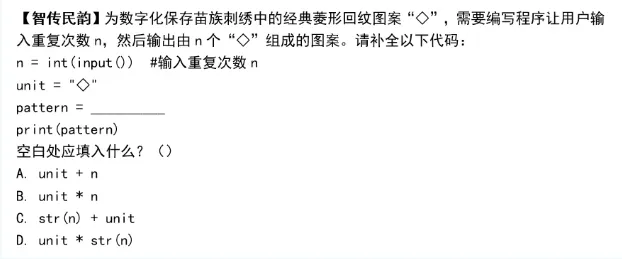 - 客观题示例:围绕“生成菱形回纹图案”,考查字符串重复运算。正确连接n个单元图案应使用