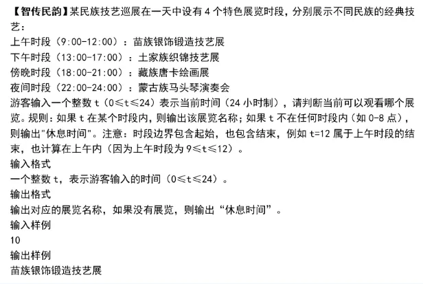 - 编程题示例(“民族技艺巡展时段查询”):题目要求根据输入时间t,判断所属时段并输出对应展览名称。