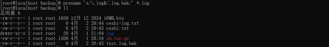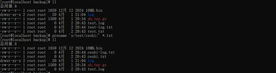 把所有.txt文件名里的test替换成ceshi:#示例:test1.txt → ceshi1.txt、test-log.txt → ceshi-log.txtprename 's/test/ceshi/' *.txt