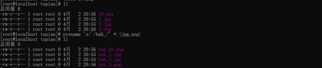 #示例:1.jpg → bak_1.jpg、2.png → bak_2.pngprename 's/^/bak_/' *.{jpg,png}