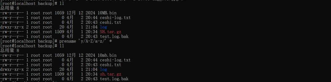 # 1.批量替换字符(test→ceshi,仅txt文件)prename 's/test/ceshi/' *.txt# 2.批量修改后缀(log→log.bak)prename 's/\.log$/.log.bak/' *.log# 3.批量加前缀(bak_)prename 's/^/bak_/' *.{jpg,png,txt}# 4.批量删多余字符(删除_tmp)prename 's/_tmp//' *# 5.批量按序号命名(img_001.jpg格式)prename 's/.*/sprintf("img_%03d.jpg", $::i++)/e' *.jpg# 6.大小写转换(大写→小写)prename 'y/A-Z/a-z/' *# 7.批量删后缀(删除.tmp)prename 's/\.tmp$//' *.tmp# 8.替换特殊字符(空格→下划线)prename 's/ /_/g' *# 9.预览修改效果(不实际执行)prename -n '替换规则' 文件名