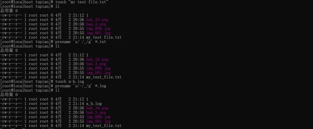 #替换空格:my file.txt → my_file.txtprename 's/ /_/g' *.txt#替换横杠:test-file.log → test_file.logprename 's/-/_/g' *.log
