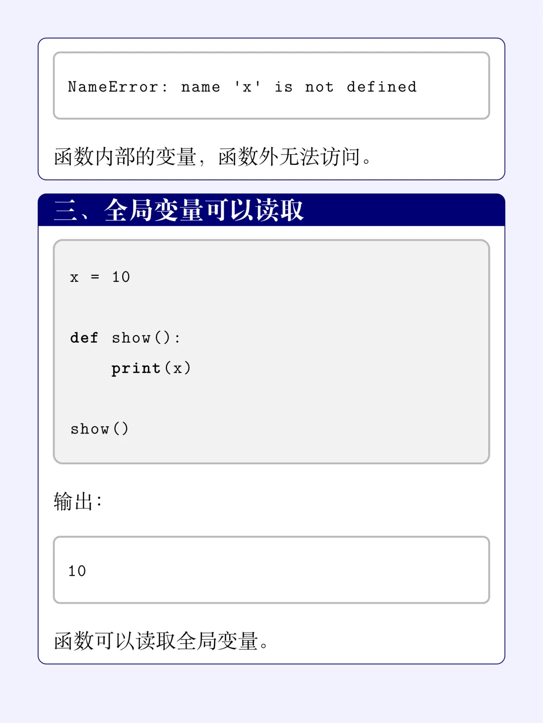 x = 10 # 全局变量def show(): print(x) # 读取全局变量show()# 输出:10