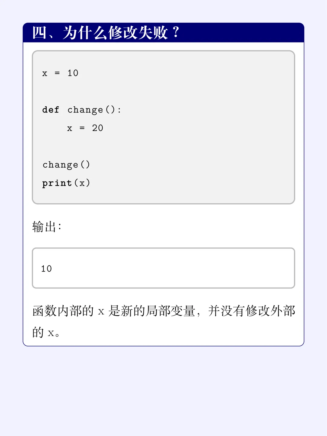 x = 10def change(): x = 20 # 试图修改change()print(x)# 输出:10