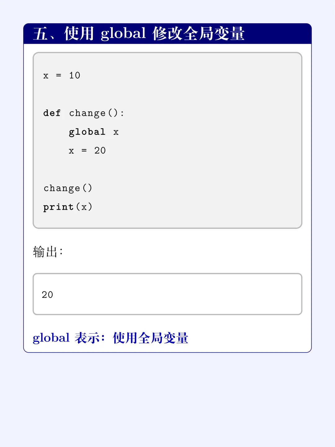 x = 10def change(): global x # 郑重声明:我要用的是外面的那个 x x = 20change()print(x)# 输出:20