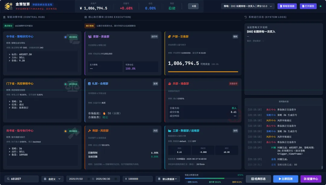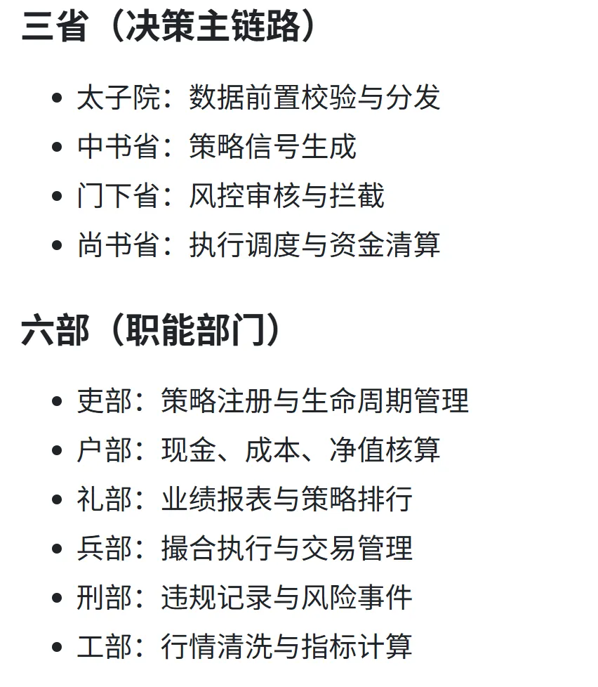 六部的分工也挺有意思。吏部管策略的"人事档案",谁在职谁离职一清二楚;户部管钱,每一分钱怎么来的怎么没的都得记账;礼部出报告,定期给你算算账、排排名;兵部管下单;刑部专门记黑账,哪笔交易违规了、哪次风控拦截了,全都留痕;工部最辛苦,负责洗数据。这六个部门各司其职,谁也别抢谁的活儿。
