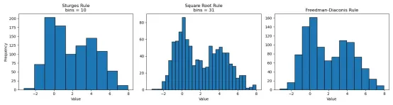 import numpy as npimport matplotlib.pyplot as pltimport seaborn as sns# 设置随机种子np.random.seed(42)# 构造一个“略微复杂”的分布(双峰)data = np.concatenate([ np.random.normal(0, 1, 500), np.random.normal(4, 1.5, 500)])# 样本量n = len(data)# 三种 bin 规则sturges_bins = int(np.log2(n) + 1)sqrt_bins = int(np.sqrt(n))# 创建画布plt.figure(figsize=(15, 4))# 1. Sturgesplt.subplot(1, 3, 1)plt.hist(data, bins=sturges_bins, edgecolor='black')plt.title(f"Sturges Rule\nbins = {sturges_bins}")plt.xlabel("Value")plt.ylabel("Frequency")# 2️.平方根法plt.subplot(1, 3, 2)plt.hist(data, bins=sqrt_bins, edgecolor='black')plt.title(f"Square Root Rule\nbins = {sqrt_bins}")plt.xlabel("Value")# 3️. Freedman-Diaconisplt.subplot(1, 3, 3)plt.hist(data, bins='fd', edgecolor='black')plt.title("Freedman-Diaconis Rule")plt.xlabel("Value")plt.tight_layout()plt.show()