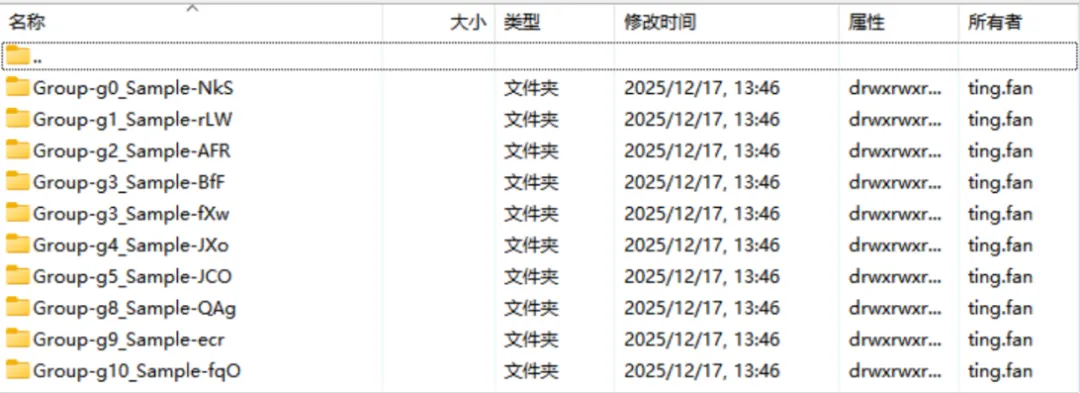 其中,文件夹名由组名和样本名组成,如“Group-g0_Sample-NkS”中,组名为g0,样本名为NkS。因此最终的目标为提取test目录下所有的组名(g0,g1,g2, ...)和样本名(NkS,rLW,AFR, ...)