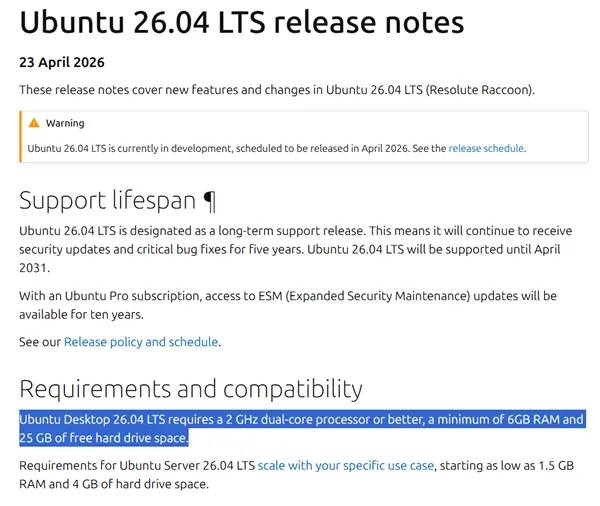 根据官方更新日志,Ubuntu 26.04 LTS需要至少6GB内存,同时处理器不得低于2GHz双核心,硬盘空间不得少于25GB。