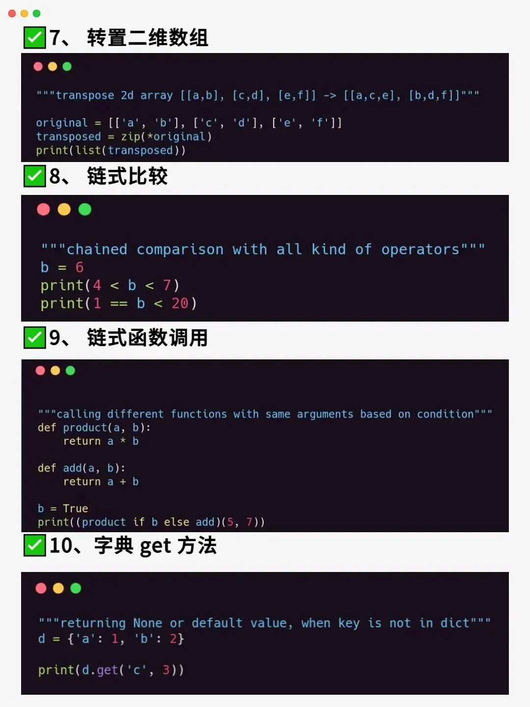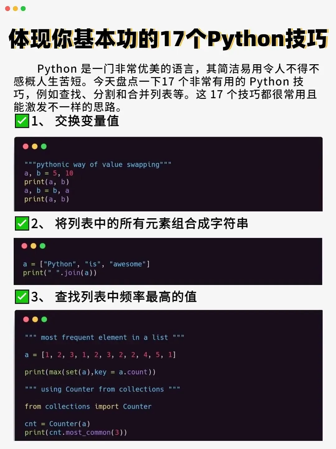 写 Python 总停留在基础语法,代码臃肿又低效?快来测测你的基本功!精选 17 个超实用 Python 高阶小技巧,涵盖精简写法、数据处理、循环优化、变量妙用、效率提速等核心细节,短小精悍、拿来就用,既能自测功底,又能直接融入日常代码,轻松告别新手冗余写法,瞬间拉高编程段位!