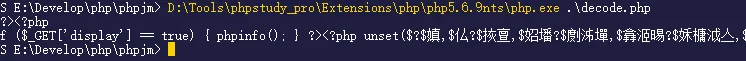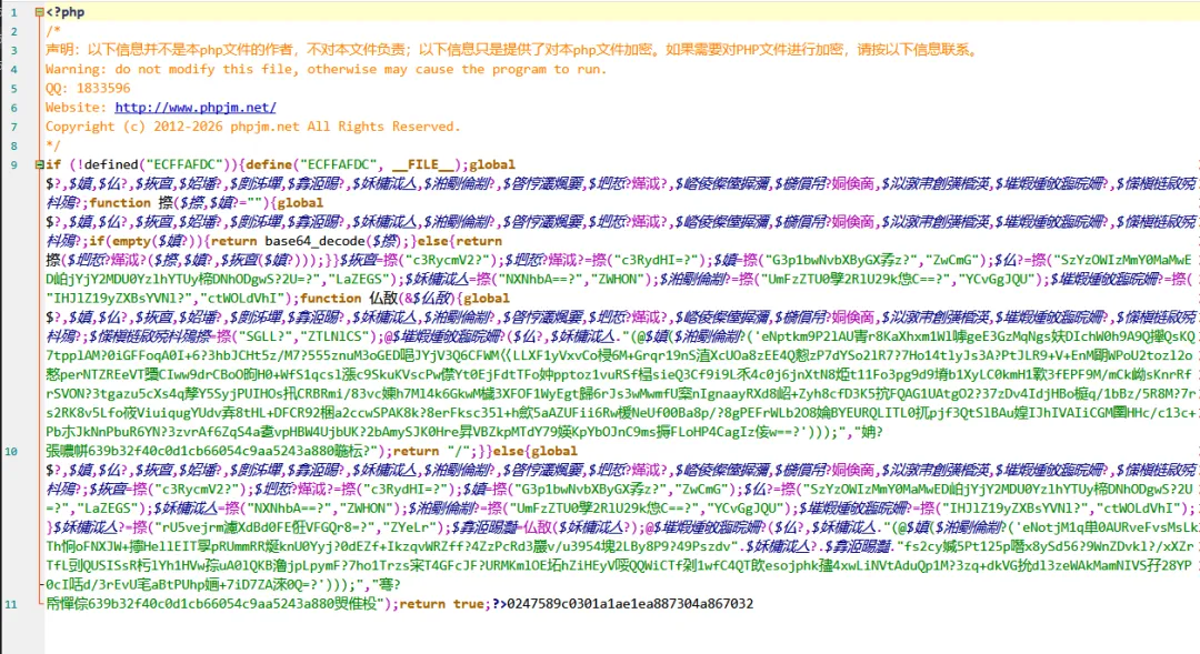 需要注意的是phpjm.net的加密算法只能使用php<7的版本使用,根据报错推测原因是加密过程中会掺杂一些随机的字符,而这些字符对于php7来说都是非法字符,识别上较为严格,无法执行,php5则会静默忽略或跳过。经过phpjm混淆过后会变成了下面样子