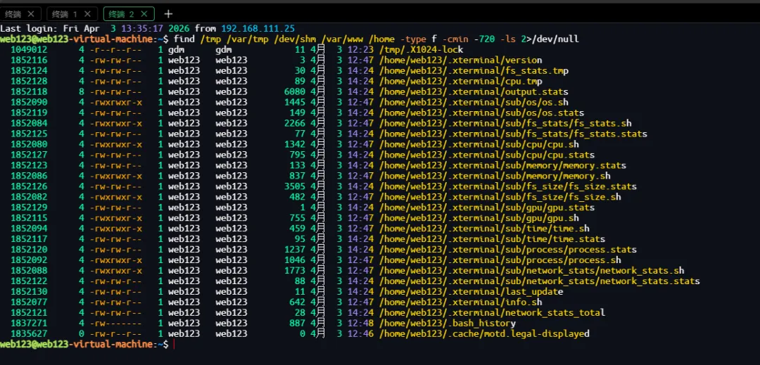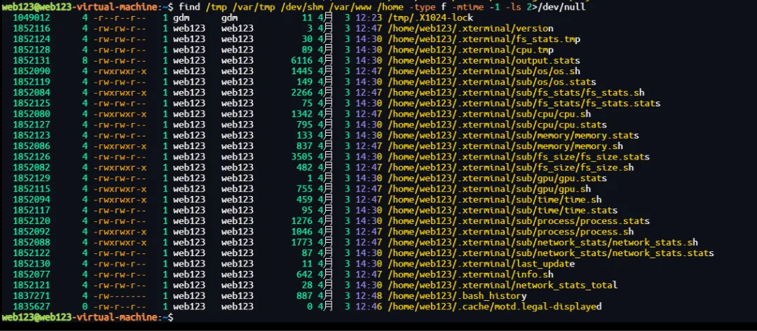 /tmp、/var/tmp、/dev/shm(内存临时文件系统)、/var/www(常见 Web 根目录)、/home(用户主目录)。-type f(普通文件)、-cmin -720(状态更改时间 ctime 在最近 720 分钟以内,即 12 小时内)。-ls 以类似 ls -l 的格式显示详细信息(包括 inode、权限、链接数、所有者、大小、修改时间、文件名等)。2>/dev/null 丢弃权限拒绝等错误信息。这个用来安全检查或入侵排查,快速定位近期在临时目录、Web 目录及用户目录中被创建或修改的文件,这些位置常被攻击者用于存放恶意脚本、后门或临时载荷。