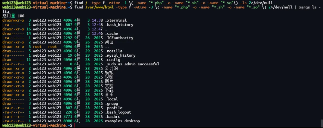 find 输出的文件路径(每行一个)传递给 xargs。xargs ls -lta:对每个文件(或批量)执行 ls -lta。-l:长格式列表(权限、链接数、所有者、大小、修改时间、文件名)。-t:按修改时间排序(最新修改的排在前面)。-a:显示所有文件(包括以点开头的隐藏文件,但 find 匹配的文件名通常不包含隐藏文件,此选项影响不大)。最终效果:在 /var/www/html 目录下找出最近 3 天内修改过的 .php、.sh 或 .so 文件,并按修改时间从新到旧列出详细信息。