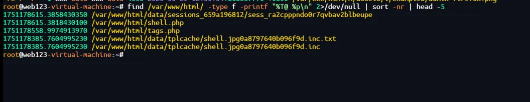 这里我们已经把信息收集的差不多差不多了,直接输命令列出所有文件并按修改时间排序,查看最新的几个:find /var/www/html/ -type f -printf "%T@ %p\n" 2>/dev/null | sort -nr | head -5