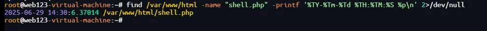 find / -type f -mtime -1 \( -name "*.php" -o -name "*.sh" -o -name "*.so" \) -ls 2>/dev/null| sort这里因为其实我们已经知道了shell.php是最先打进来的一个shell后门所以我们可以直接查看这个即可:find /var/www/html -name "shell.php" -printf '%TY-%Tm-%Td %TH:%TM:%S %p\n' 2>/dev/null