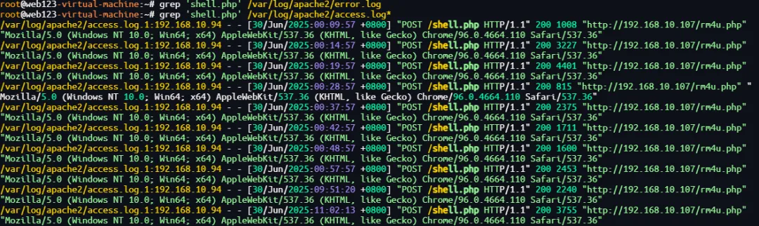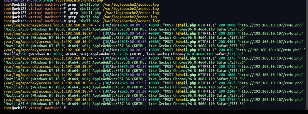 grep 'shell.php' /var/log/apache2/access.loggrep 'shell.php' /var/log/apache2/error.log