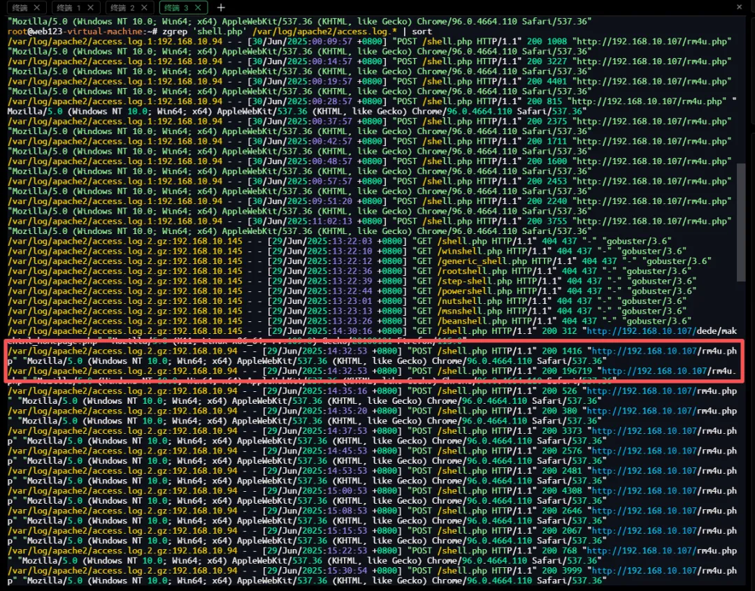 zgrep:用于在 gzip 压缩的日志文件中搜索字符串(自动解压)。/var/log/apache2/access.log.*:匹配所有以 access.log. 开头的文件,包括:access.log.1、access.log.2.gz、access.log.3.gz 等轮转后的日志。access.log(无后缀),如果需要包括当前日志,应使用 access.log* 或单独添加。| sort:对结果按行排序(通常是按时间顺序或字典序)。