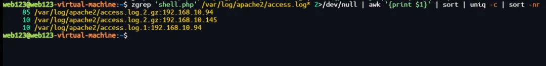 zgrep 'shell.php' /var/log/apache2/access.log* 2>/dev/null | awk '{print $1}' | sort | uniq -c | sort -nr窝趣,这么多?应该是这个IP了:192.168.10.94