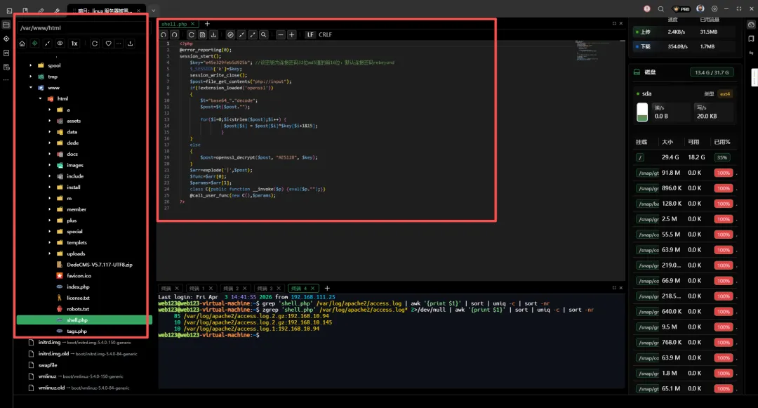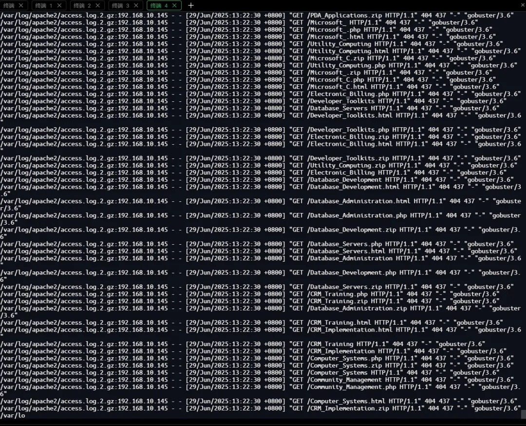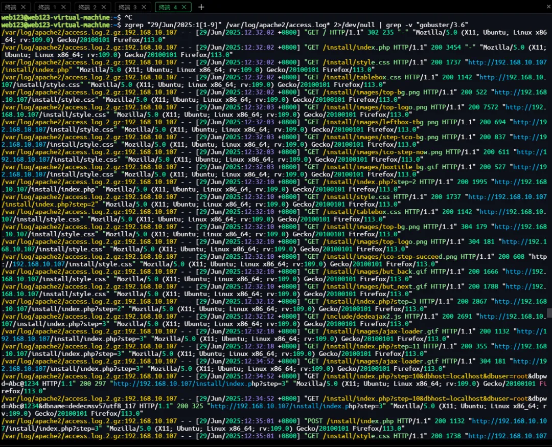 /var/log/apache2/access.log.1:192.168.10.145 - - [29/Jun/2025:13:40:05 +0800] "POST /dede/login.php HTTP/1.1" 200 1540 "http://192.168.10.107/dede/login.php" "Mozilla/5.0 (X11; Linux x86_64; rv:109.0) Gecko/20100101 Firefox/115.0"/var/log/apache2/access.log.1:192.168.10.145 - - [29/Jun/2025:13:40:06 +0800] "GET /dede/index.php HTTP/1.1" 200 4359 "http://192.168.10.107/dede/login.php" "Mozilla/5.0 (X11; Linux x86_64; rv:109.0) Gecko/20100101 Firefox/115.0"/var/log/apache2/access.log.1:192.168.10.145 - - [29/Jun/2025:13:40:06 +0800] "GET /dede/css/frame.css HTTP/1.1" 200 2464 "http://192.168.10.107/dede/index.php" "Mozilla/5.0 (X11; Linux x86_64; rv:109.0) Gecko/20100101 Firefox/115.0"/var/log/apache2/access.log.1:192.168.10.145 - - [29/Jun/2025:14:29:19 +0800] "POST /dede/makehtml_homepage.php HTTP/1.1" 200 462 "http://192.168.10.107/dede/makehtml_homepage.php" "Mozilla/5.0 (X11; Linux x86_64; rv:109.0) Gecko/20100101 Firefox/115.0"/var/log/apache2/access.log.1:192.168.10.145 - - [29/Jun/2025:14:29:21 +0800] "GET /tags.php HTTP/1.1" 200 312 "http://192.168.10.107/dede/makehtml_homepage.php" "Mozilla/5.0 (X11; Linux x86_64; rv:109.0) Gecko/20100101 Firefox/115.0"/var/log/apache2/access.log.1:192.168.10.145 - - [29/Jun/2025:14:30:15 +0800] "POST /dede/makehtml_homepage.php HTTP/1.1" 200 463 "http://192.168.10.107/dede/makehtml_homepage.php" "Mozilla/5.0 (X11; Linux x86_64; rv:109.0) Gecko/20100101 Firefox/115.0"/var/log/apache2/access.log.1:192.168.10.145 - - [29/Jun/2025:14:30:16 +0800] "GET /shell.php HTTP/1.1" 200 312 "http://192.168.10.107/dede/makehtml_homepage.php" "Mozilla/5.0 (X11; Linux x86_64; rv:109.0) Gecko/20100101 Firefox/115.0"审计结果: