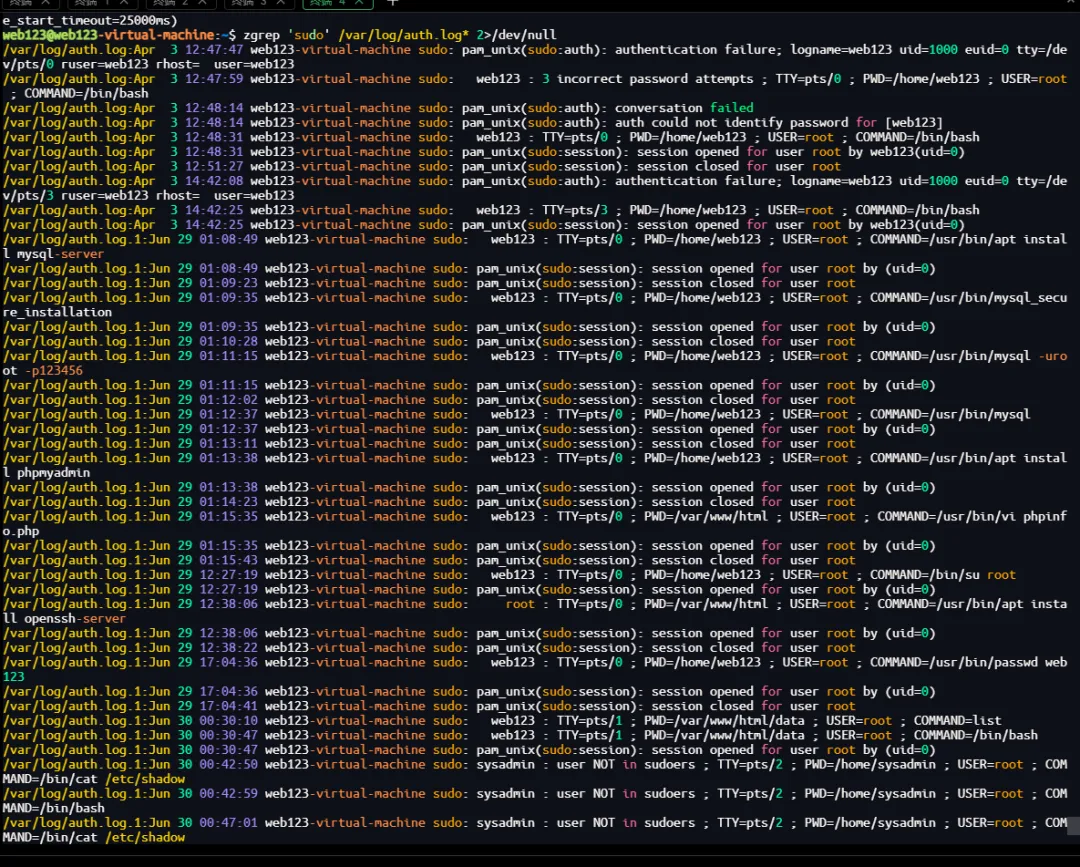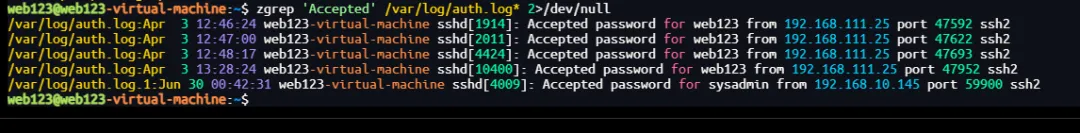 /var/log/auth.log.1:Jun 30 00:42:31 web123-virtual-machine sshd[4009]: Accepted password for sysadmin from 192.168.10.145 port 59900 ssh2zgrep 'sudo' /var/log/auth.log* 2>/dev/null