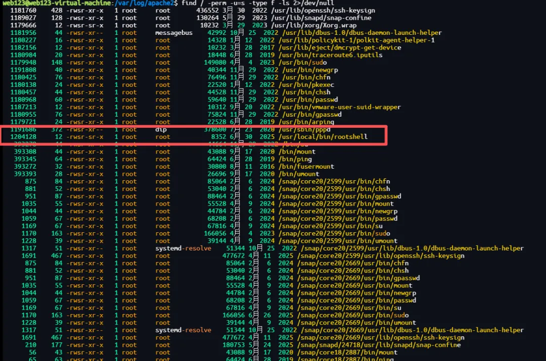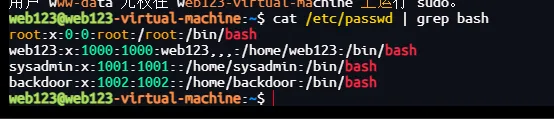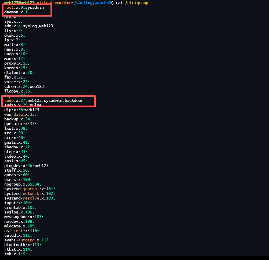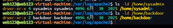 web123@web123-virtual-machine:/var/log/apache2$ ls -ld /home/sysadmindrwxr-xr-x 4 sysadmin sysadmin 4096 6月 30 2025 /home/sysadminweb123@web123-virtual-machine:/var/log/apache2$ ls -ld /home/backdoordrwxr-xr-x 2 backdoor backdoor 4096 6月 30 2025 /home/backdoor查看用户组(重点肯定是要看看root和sudo组了哈)