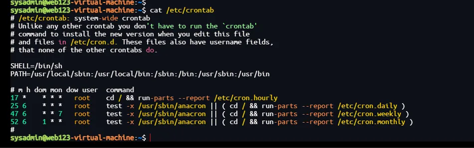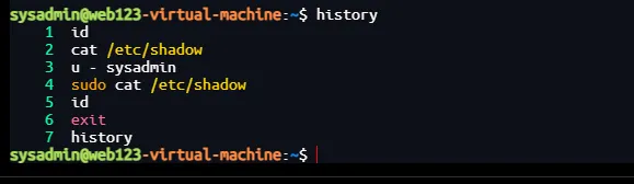 sysadmin@web123-virtual-machine:/var/spool/cron/crontabs$ history 1 id 2 cat /etc/shadow 3 u - sysadmin 4 sudo cat /etc/shadow 5 id 6 exit 7 history