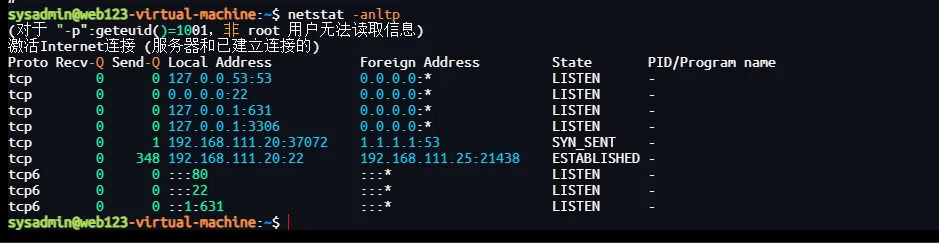 SYN_SENT 表示客户端已发送 TCP SYN 包,但未收到 SYN+ACK(可能被防火墙阻断、目标拒绝或网络问题)。该连接未成功建立。dig +tcp 或 nslookup -vc 强制使用 TCP。监听端口风险提示