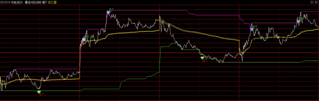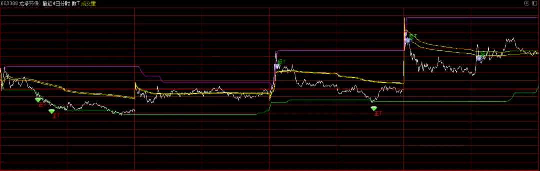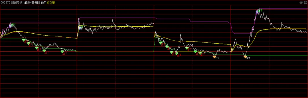 经过长时间的跟进,这个公式用来做T准确率还是可以的,当然了肯定不是100%,也不存在100%准确的,不然都躺赚了。正T有两种款式,一种用绿色钻石+红色“正T”文字,一种黄色钻石+白色“正T”,正T表示可以买入了,反T表示可以卖出。在一些支持编写可视化代码的软件中,暂时没看到支持分时图信号预警的,也许是我还没发掘出来。但是在QMT(Quantitative Trading Platform)等一些专业量化软件中是可以的,TdxQuant可不可以实现还在研究中。不过换句话说,如果没有很大的资金量,搞日内高频还是没太大必要去自动化了,因为付出与回报不对等,资金量不大优先考虑盈亏比高的策略,就是说策略要朝这个方向去开发和完善。新人学习公式最最重要的是不要以准确率为唯一标准,因为这很容易掉进陷阱。准确性极高的你拿不到,你看到的准确性高是事后诸葛亮,也就是说用了今天的数据去完善昨天的指标信号,也称为未来函数。我也曾掉过这种坑,信号每天都出现,都提示是最低点了,马上要反转了,于是买进去之后,明天继续暴跌,并且在明天看不到今天能看到的出现在今天的信号,后来我把手上的全部代码公式统统检查一遍,凡带未来函数的全部删除。这个分时图做T的公式没有未来函数,信号稳定,综合准确性75%—85%吧,极端行情需结合其他信息综合判断,避免卖空或被套。注意做T函数不适合选股和择时买新股,用在已有持股情况下降低成本比较合适,当某天波动非常大的时候用好了还是有些意义的。