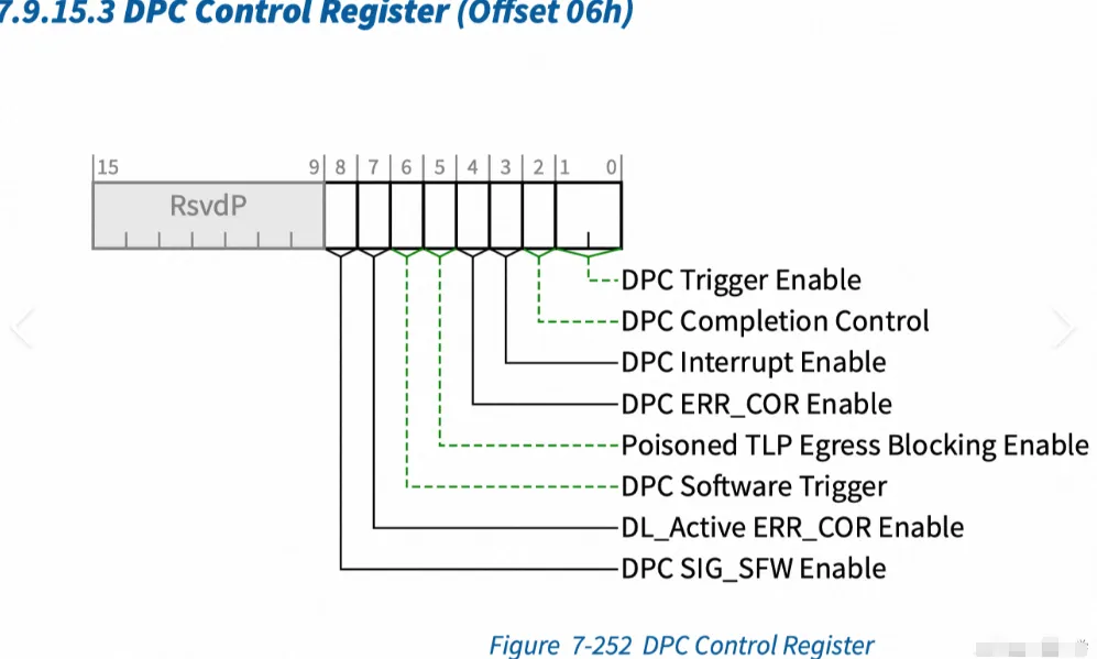 - 主要功能:当在端口或端口下游检测到未屏蔽的不可纠正错误时,DPC会停止Downstream Port下方的PCI Express流量,避免数据损坏的潜在传播
