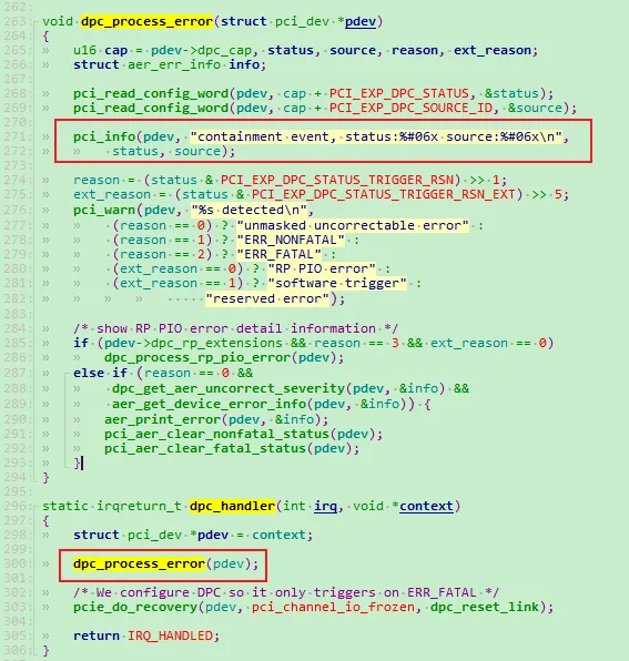 void dpc_process_error(struct pci_dev *pdev) { // 读取DPC状态寄存器 pci_read_config_word(pdev, cap + PCI_EXP_DPC_STATUS, &status); // 读取错误源ID pci_read_config_word(pdev, cap + PCI_EXP_DPC_SOURCE_ID, &source); // 解析错误原因 reason = (status & PCI_EXP_DPC_STATUS_TRIGGER_RSN) >> 1; ext_reason = (status & PCI_EXP_DPC_STATUS_TRIGGER_RSN_EXT) >> 5; // 特殊错误处理分支 if (pdev->dpc_rp_extensions && reason == 3 && ext_reason == 0) { dpc_process_rp_pio_error(pdev); } else if (reason == 0 && dpc_get_aer_uncorrect_severity(pdev, &info) && aer_get_device_error_info(pdev, &info)) { aer_print_error(pdev, &info); pci_aer_clear_nonfatal_status(pdev); pci_aer_clear_fatal_status(pdev); }}