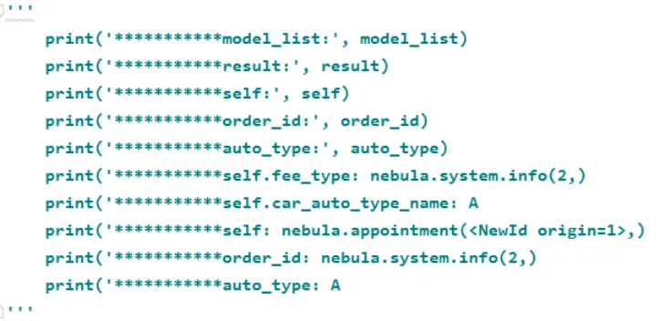 在需要调试的地方,点击行号位置,打上断点,点击debug图标运行,当程序运行到断点位置,就可以查看当前内存值了。我们可以在适当的时候使用print命令输出要检查参数值,这样可以快速定位问题所在。以下代码我们可以放在合适的地方,用大量*号是为了在调试信息中快速找到需要的数据。