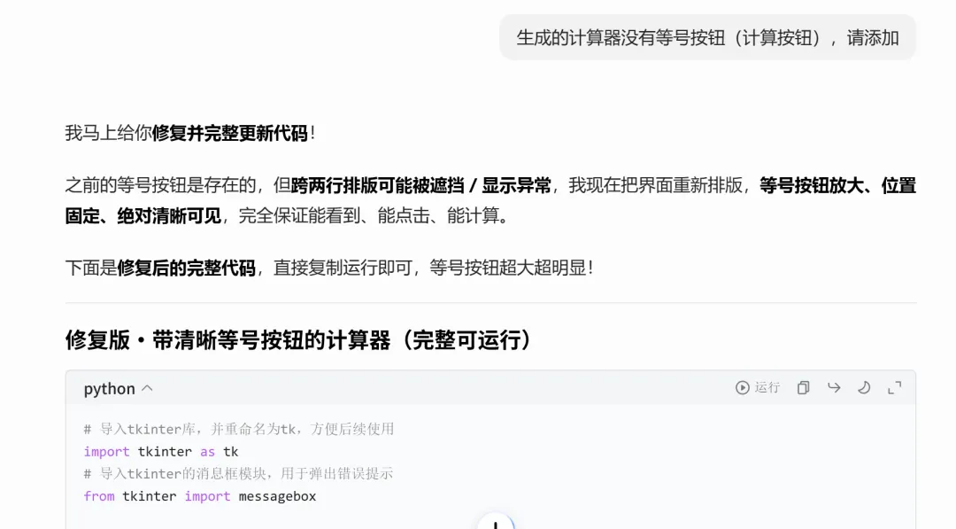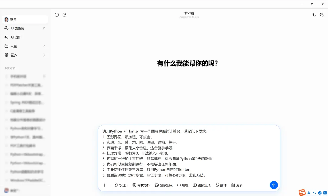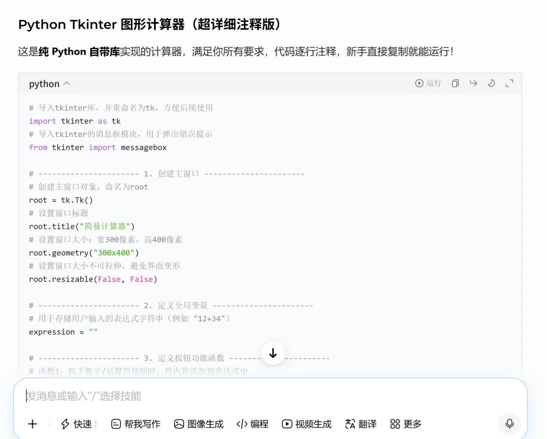 你直接把下面这段话发给豆包/文心一言/ChatGPT,AI就会给你生成完整可运行的Tkinter图形计算器。
