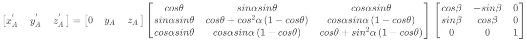点A坐标为(0,yA,zA),单位向量u=(0,cos α,sin α)位于平面yoz上,并与y轴夹角为α。点A绕单位向量u旋转θ,然后绕z轴逆时针旋转β后得到坐标A'为