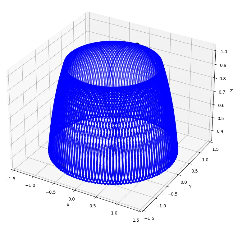 代码逻辑可分为三个核心模块。旋转函数通过rotate_point_around_axis实现点绕单位向量旋转后的坐标计算,基于罗德里格斯旋转公式构造旋转矩阵,并与绕Z轴的旋转矩阵结合完成复合旋转变换。