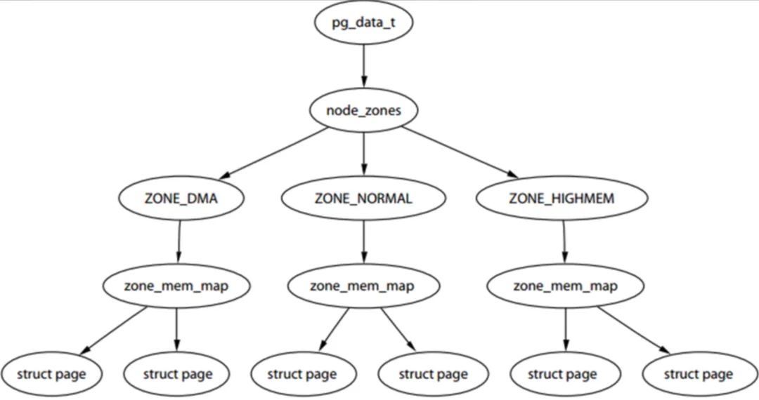 内存被划分为节点,内存的每个节点都是有pg_data_t来描述的,该结构体在include/linux/mmzone.h。然后节点又被划分为内存管理区域,通过struct zone_struct来描述,被定义为zone_t,一般低端范围的16MB被标为ZONE_DMA,可以被直接映射到内核的普通内存域为ZONE_NORMAL,超出内核段的物理地址域为ZONE_HIGHMEM,也统称为高端内存,是系统预留的可用内存空间,不能被内核直接映射,最后就是页帧了(Page Frame),最小的系统内存单位,堆内存中的每个页都会创建一个strcut page的一个实例。