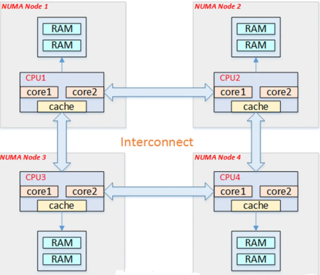 在ARM的架构中,基本采用均匀存储器存取(Uniform-Memory-Access,简称UMA)模型UMA,所有处理器对内存的访问都是一致的。 上图可以看出当处理器的核变多后,我们的内存带宽将反而成为瓶颈。 当然人们肯定是已经想到了这个问题,因此又提出一个非均匀存储器存取(Nonuniform-Memory-Access,简称NUMA)模型,即处理器被划分成多个节点,每个节点被分配本地存储器空间,所有节点中的处理器都可以访问全部的系统物理存储器,但是访问本节点内的存储器所需要的时间,比访问某些远程节点的存储器所花时间少的多,随着芯片封装技术的能力增加,这个模型被用于更多CPU了。此时内存被分割成多个区域(BANK,也称“簇”),依据簇与处理器的“距离”不同,访问不同簇的代码也会不同。大体如下:这样各个cup就有内存直接处理。当然也不说是这个方案就是完美的,当你的核要访问另一个核,那么势必会增加指令的流水线,主要还是要看应用的场景,目前在嵌入式行业中,我们大体都是用UMA的模型哈。