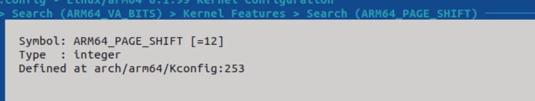 可以看到对应PAGE_SHIFT为12。这里比较要注意的是CONFIG的选项和32位系统差别还是很大的。