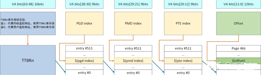 ARM64中的Linux的分页模式分别为页全局目录(Page Global Directory,PGD)、页上级目录(Page Upper Directory,PUD)、页中间目录(Page Middle Directory,PMD)、页表(Pega Table,PT)