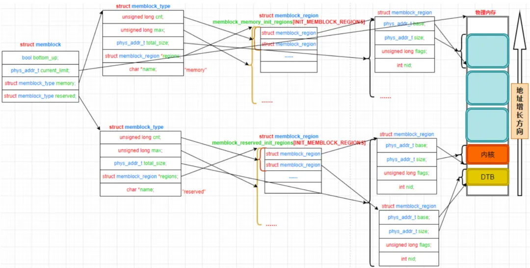 memblock其前任为bootmem,不过bootmem已经退休,目前全部都由memblock来完成。而memblock顾名思义,就是内存被分为一块一块的,内核以memblock_region的结构体表示一块,它的base和size字段分别表示块的起始地址和大小。memblock_type分为memory(可用内存)与reserved(被预留的内存)。