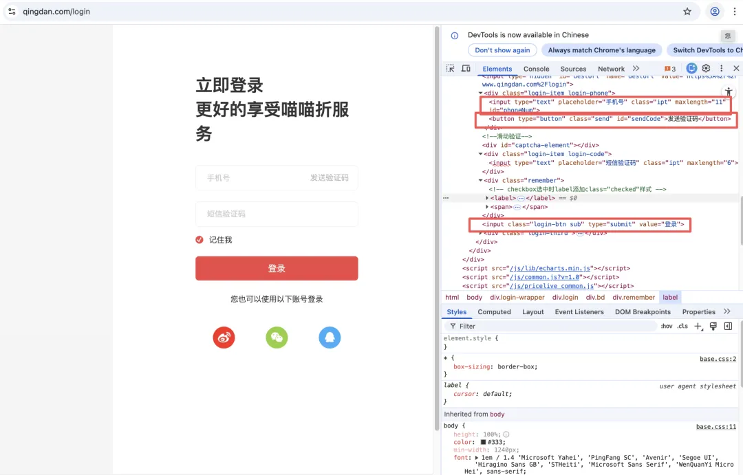 我们先打开喵喵折网站的登录页面,并且左键打开检查: